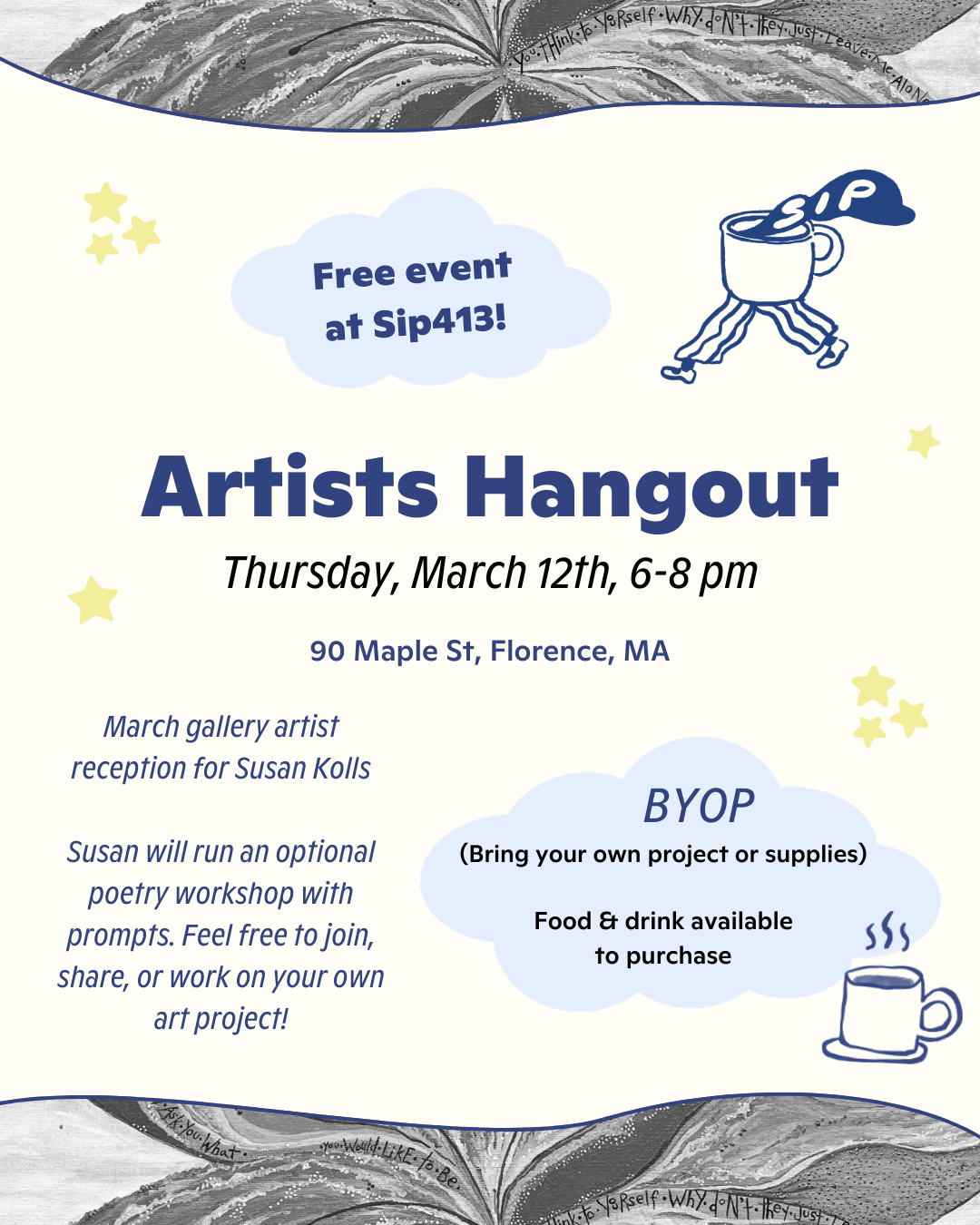 Come hang out with us *after hours* at our “Artists Hangout” event! A chill evening of arts & crafts every second Thursday from 6:30-8:30pm for creatively-inclined folks to come hang out and mingle! This event is free and BYOP (bring your own project). We will have our full drink menu and pastries available to purchase throughout the event. Masks are optional, and will be available at the door.