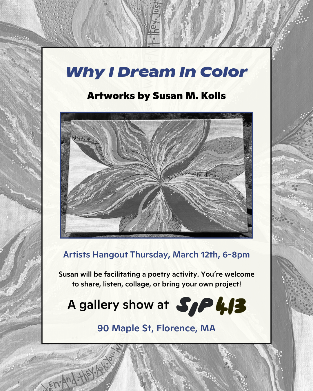Susan M. Kolls is a disabled artist who moved to Western Massachusetts five years ago, with her two adult children. Since that time she has learned to embrace the challenges of painting on canvas, and the views from Mt. Tom.
